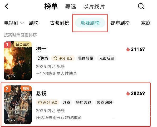 而截止到目前为止,《悬镜》虽然仅播出了4集,评分却早已达到了9.0,更是一度登上了悬疑榜第二的位置。